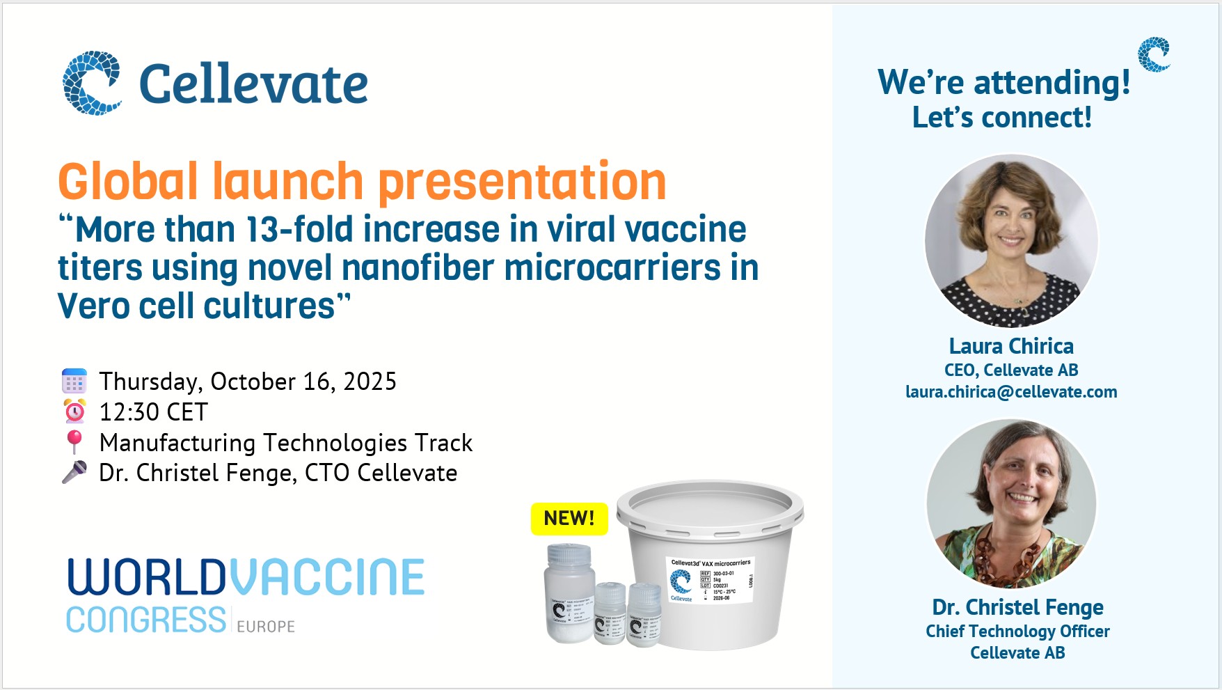 LUND, Sweden, October 13, 2025 – Cellevate AB today announced the upcoming global launch at the World Vaccine Congress Europe in Amsterdam, October 14–16, 2025 of Cellevat3d® VAX nanofiber microcarriers for adherent cell-based viral vaccine production. Join our launch event and company presentation on October 16 at 12:30 in the Manufacturing Technologies track, where CTO Dr. Christel Fenge will present the outstanding performance data.